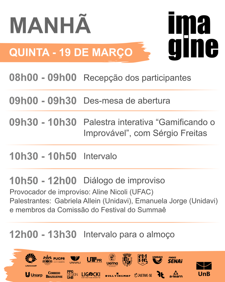 A segunda edição do Simpósio de Educação Criativa e Tecnologias (chamado por nós de "Imagine"), promovido pela Universidade de Brasília, tem como objetivo principal reunir pesquisadores e interessados na temática de Educação criativa e tecnologias educacionais.